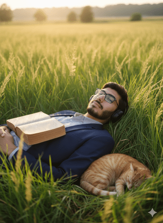 Create an image of a human subject (using the exact face from the provided selfie • no editing,no retouching, no smoothing, preserve naturalskin texture), keeping their original face andsharp features with the highest clarity, ultra-HD,natural skin texture, and sharp focus. Thescene is a cinematic shot captured with aprofessional-grade DSLR camera, using a wideaperture (f/1.8) for a soft, blurred background,styled in a peaceful and cinematic way with awarm golden-hour color palette. The subject islying relaxed in a field of tall, green pampasgrass under warm afternoon sunlight, wearingthe same outfit as shown in the providedreference image, with headphones on and alarge book resting open on their chest, while anorange cat naps peacefully beside them. Thesetting is a serene meadow, with softbackground focus, gentle sunlight, and sunflares adding a dreamy effect, with thesubject’s face clearly visible as the focal pointof the image.