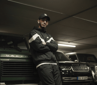 leaning against a Land Rover Defender