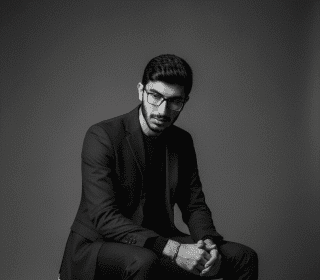 Prompt HE'S WEARING SUNGLASSES AND A BLACK SUIT, STANDING CASUALLY LOOKING AT…