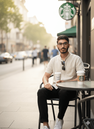 GENERATE A HYPER-REALISTIC CINEMATIC PHOTO OF THE UPLOADED PERSON, PRESERVING THE FACE 100% EXACTLY AS IN THE PROVIDED SELFIE. HE IS SEATED AT AN OUTDOOR STARBUCKS TERRACE TABLE, HOLDING A STARBUCKS COFFEE CUP WITH “[Talha]” HANDWRITTEN ON IT IN MARKER. HIS OUTFIT CONSISTS OF A LICHT BEIGE SHORT-SLEEVE LINEN SHIRT, SLIM BLACK TROUSERS, AND CLEAN WHITE SNEAKERS, WITH SUNGLASSES CASUALLY RESTING ON HIS COLLAR. THE BACKGROUND FEATURES A SUNLIT URBAN STREET WITH PEOPLE WALKING AND BLURRED TRAFFIC, COMPLEMENTED BY THE ICONIC GREEN STARBUCKS LOCO SIGNAGE IN VIEW, CREATING A LIVELY AND CINEMATIC ATMOSPHERE.